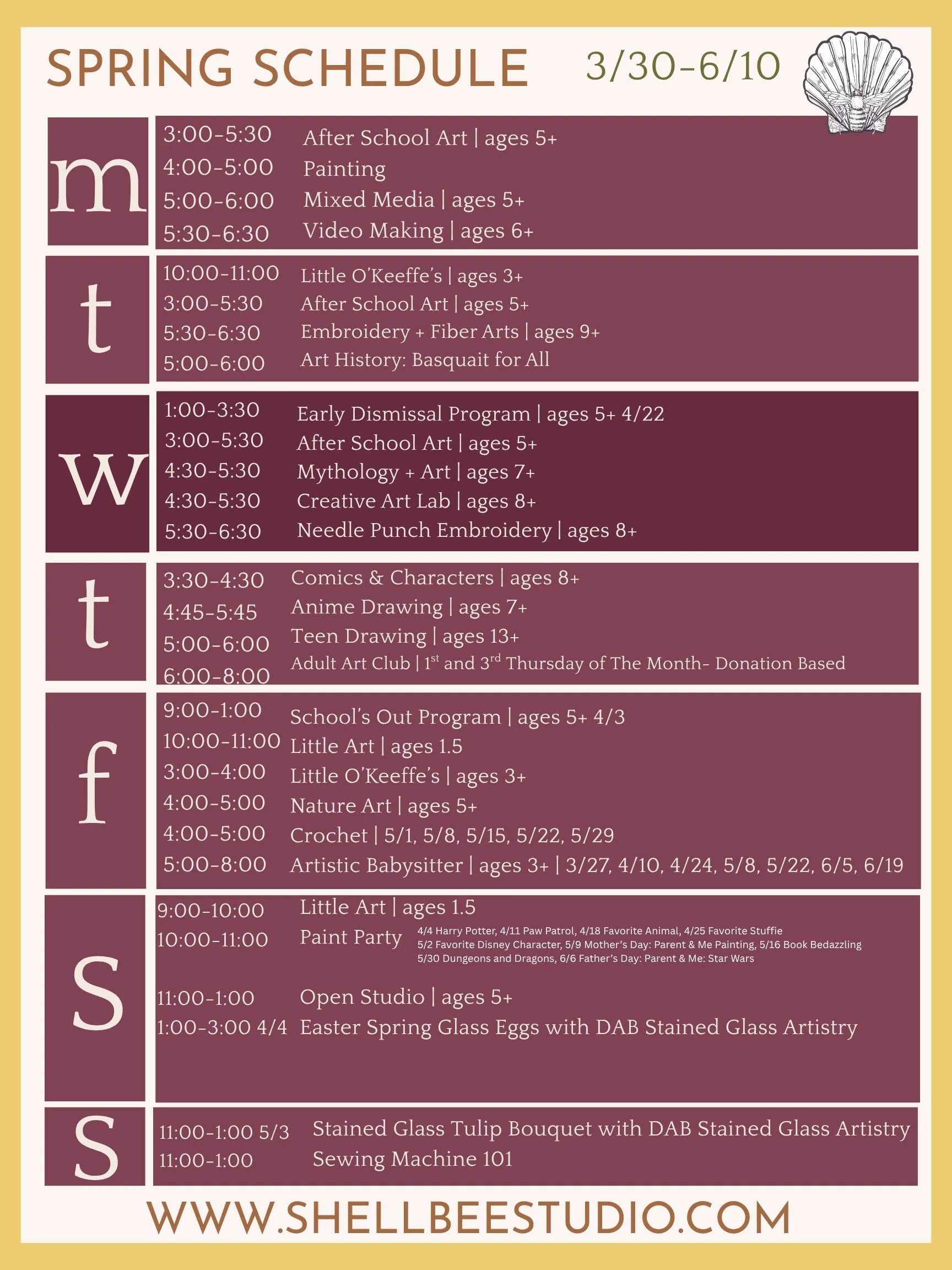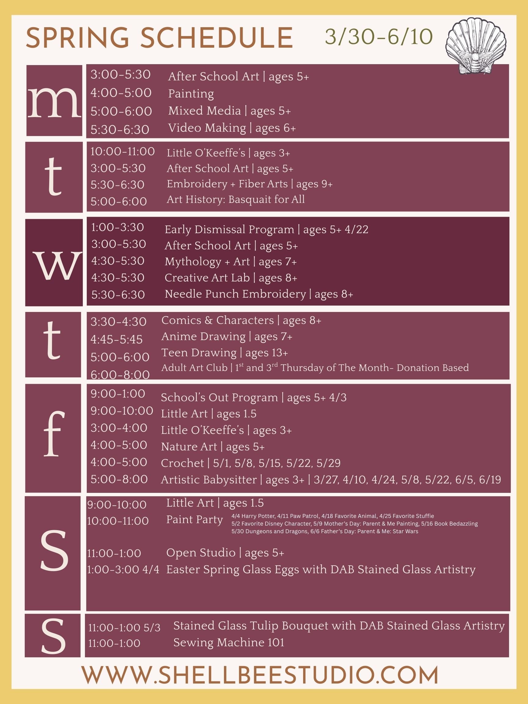 To register call 8603223986, email shellbeestudio@gmail.com or visit www.shellbeestudio.com